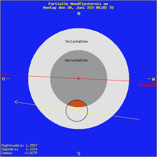 Mondfinsternis am Montag den 30. Juni 223 06:02 TD Saros Serie: 62 Mitglied: 48 von 74Inex Serie: 49Lunation: -21973 Abbildung zeigt das Maximum