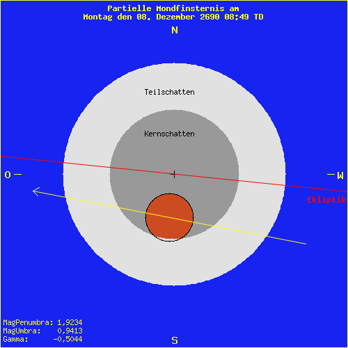 Mondfinsternis am Samstag den 14. Juni 2690 00:45 TD Saros Serie: 141 Mitglied: 61 von 72Inex Serie: 59Lunation: 8539 Abbildung zeigt das Maximum
