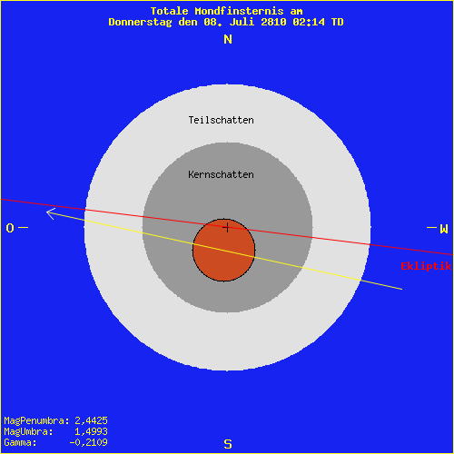 Mondfinsternis am Donnerstag den 08. Juli 2810 02:14 TD Saros Serie: 152 Mitglied: 40 von 72Inex Serie: 48Lunation: 10024 Abbildung zeigt das Maximum