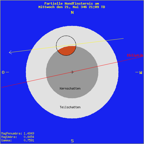 Mondfinsternis am Mittwoch den 21. Mai 346 21:09 TD Saros Serie: 65 Mitglied: 61 von 86Inex Serie: 51Lunation: -20453 Abbildung zeigt das Maximum