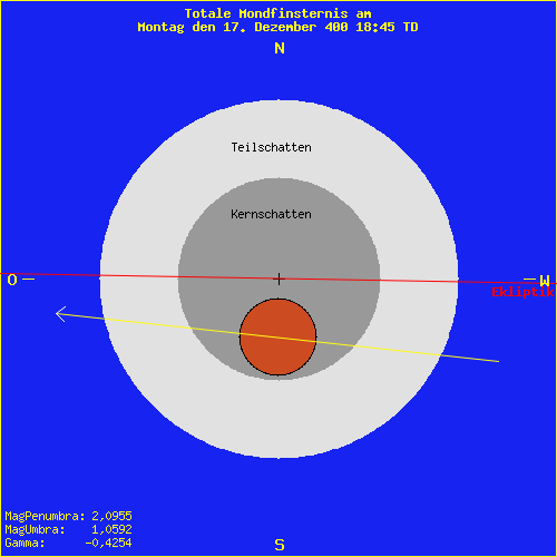 Mondfinsternis am Montag den 17. Dezember 400 18:45 TD Saros Serie: 70 Mitglied: 52 von 72Inex Serie: 46Lunation: -19778 Abbildung zeigt das Maximum