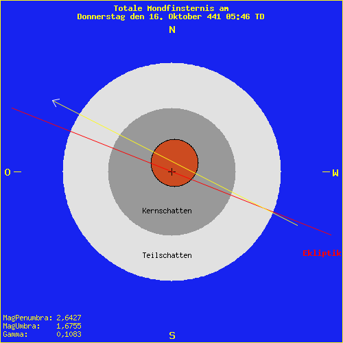 Mondfinsternis am Donnerstag den 16. Oktober 441 05:46 TD Saros Serie: 82 Mitglied: 37 von 84Inex Serie: 29Lunation: -19273 Abbildung zeigt das Maximum