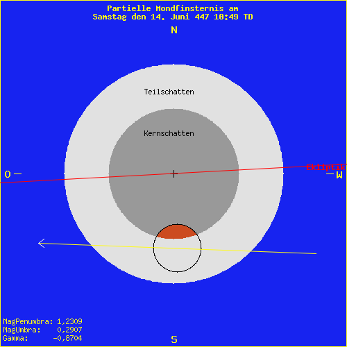 Mondfinsternis am Samstag den 14. Juni 447 10:49 TD Saros Serie: 66 Mitglied: 63 von 84Inex Serie: 55Lunation: -19203 Abbildung zeigt das Maximum