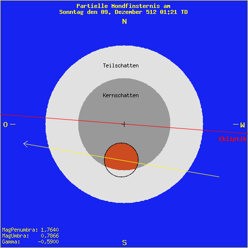 Mondfinsternis am Sonntag den 09. Dezember 512 01:21 TD Saros Serie: 72 Mitglied: 51 von 72Inex Serie: 49Lunation: -18393 Abbildung zeigt das Maximum