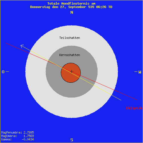 Mondfinsternis am Donnerstag den 27. September 535 06:26 TD Saros Serie: 84 Mitglied: 36 von 84Inex Serie: 31Lunation: -18111 Abbildung zeigt das Maximum