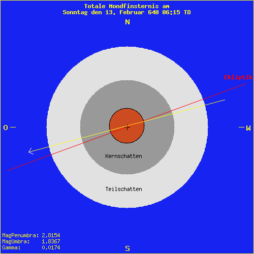 Mondfinsternis am Sonntag den 13. Februar 640 06:15 TD Saros Serie: 82 Mitglied: 48 von 84Inex Serie: 40Lunation: -16820 Abbildung zeigt das Maximum