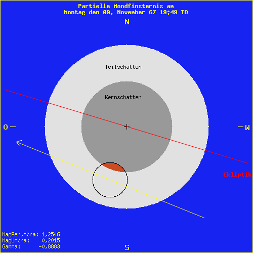 Mondfinsternis am Montag den 09. November 67 19:49 TD Saros Serie: 56 Mitglied: 52 von 72Inex Serie: 50Lunation: -23898 Abbildung zeigt das Maximum