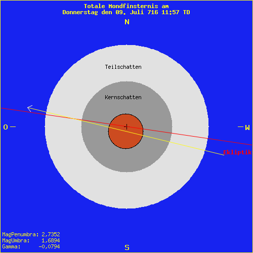 Mondfinsternis am Donnerstag den 09. Juli 716 11:57 TD Saros Serie: 89 Mitglied: 37 von 72Inex Serie: 33Lunation: -15875 Abbildung zeigt das Maximum