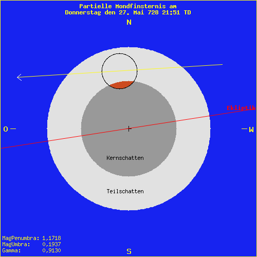 Mondfinsternis am Donnerstag den 27. Mai 728 21:51 TD Saros Serie: 100 Mitglied: 17 von 79Inex Serie: 16Lunation: -15728 Abbildung zeigt das Maximum