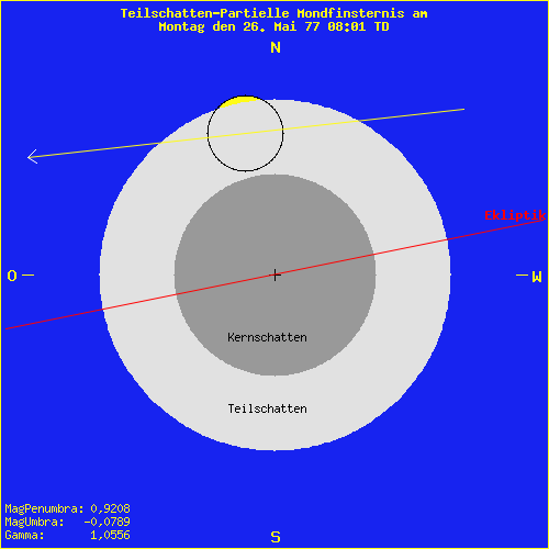 Mondfinsternis am Montag den 26. Mai 77 08:01 TD Saros Serie: 80 Mitglied: 11 von 74Inex Serie: 12Lunation: -23780 Abbildung zeigt das Maximum