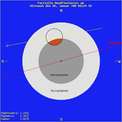 Mondfinsternis am Mittwoch den 26. Januar 780 09:24 TD Saros Serie: 75 Mitglied: 59 von 72Inex Serie: 59Lunation: -15089 Abbildung zeigt das Maximum