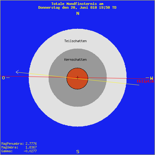 Mondfinsternis am Donnerstag den 20. Juni 810 19:50 TD Saros Serie: 91 Mitglied: 36 von 72Inex Serie: 35Lunation: -14713 Abbildung zeigt das Maximum