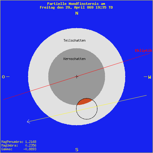 Mondfinsternis am Freitag den 29. April 869 19:35 TD Saros Serie: 103 Mitglied: 23 von 82Inex Serie: 19Lunation: -13985 Abbildung zeigt das Maximum