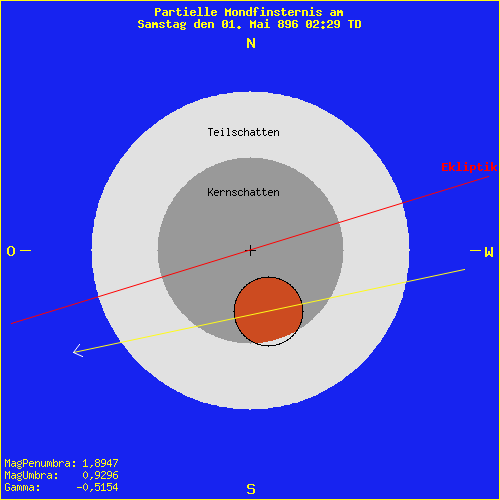 Mondfinsternis am Samstag den 01. Mai 896 02:29 TD Saros Serie: 84 Mitglied: 56 von 84Inex Serie: 51Lunation: -13651 Abbildung zeigt das Maximum