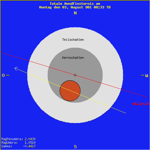 Mondfinsternis am Montag den 03. August 901 00:33 TD Saros Serie: 101 Mitglied: 31 von 83Inex Serie: 24Lunation: -13586 Abbildung zeigt das Maximum