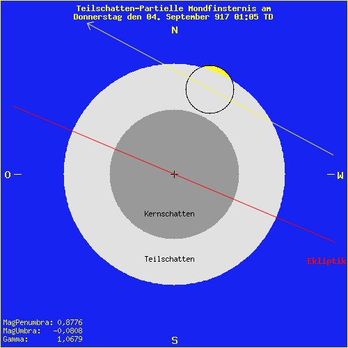 Mondfinsternis am Donnerstag den 04. September 917 01:05 TD Saros Serie: 81 Mitglied: 53 von 74Inex Serie: 57Lunation: -13387 Abbildung zeigt das Maximum